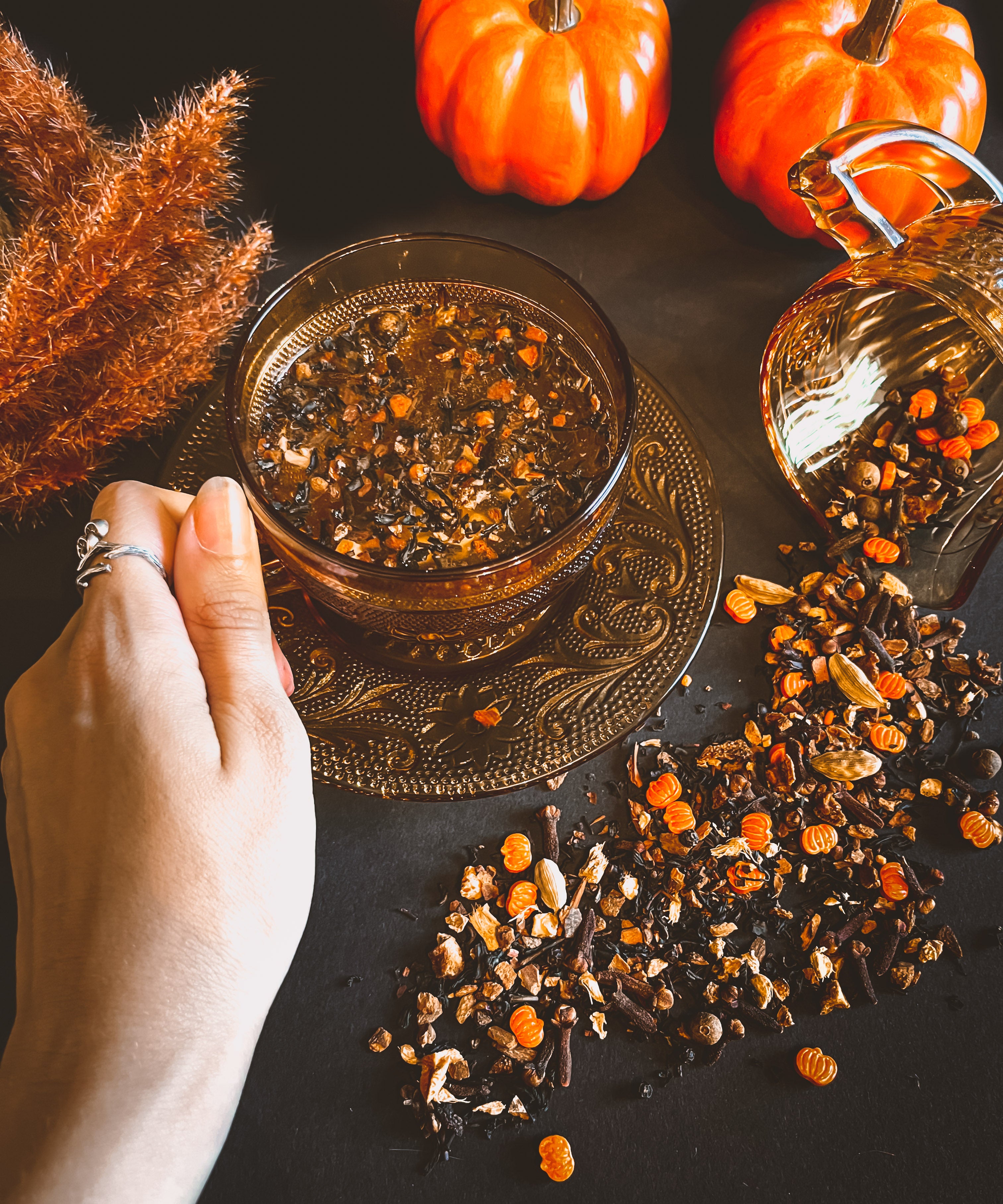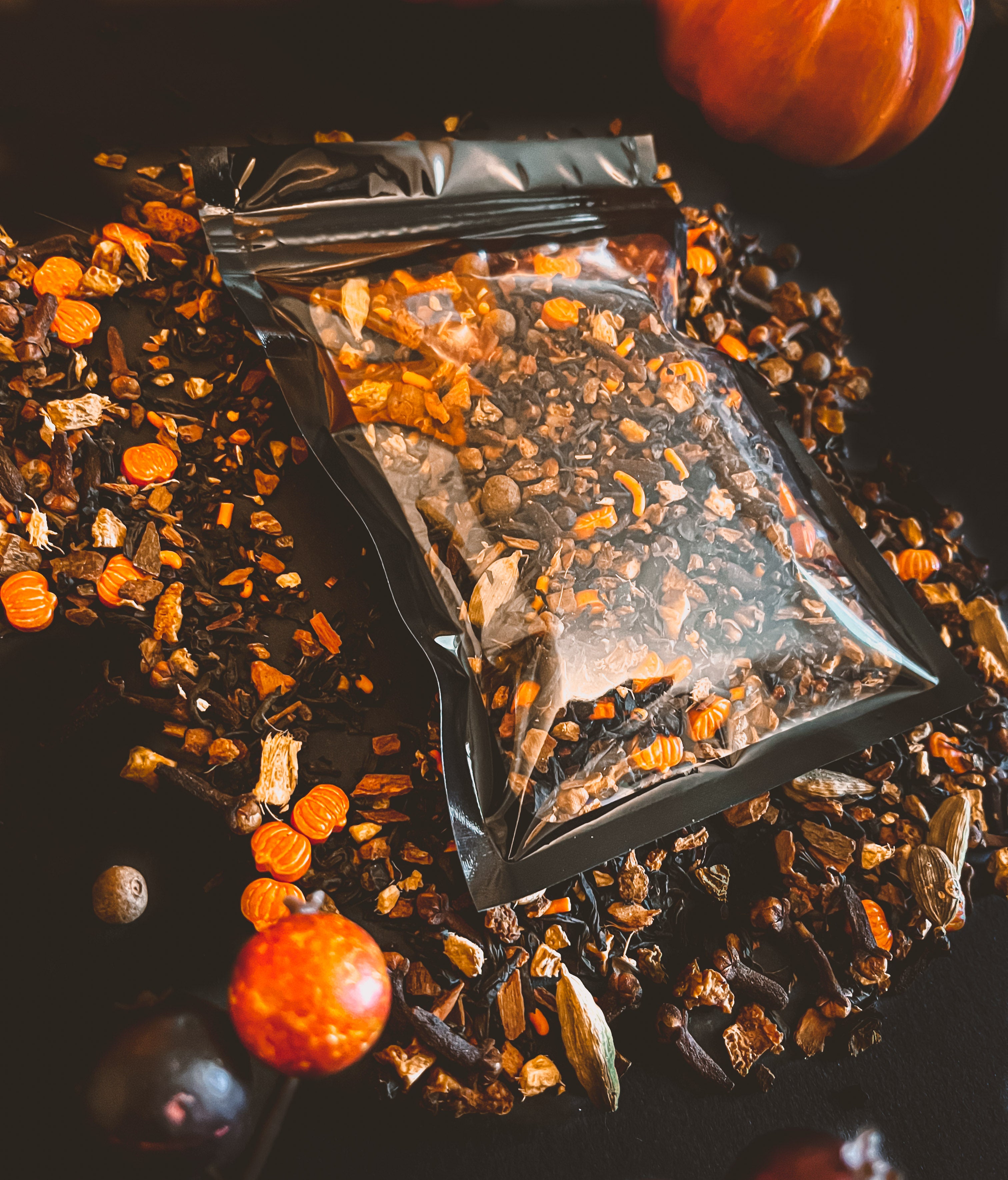 Your other fall favorite! Pumpkin Spice tea blend. This blend is a base of a rich black tea, hand mixed with clove, cinnamon, ginger, cardamom- with a hint of pepper and orange. This years Pumpkin Spice tea will also have small handmade pumpkin sprinkles, to add to your festive mood!
